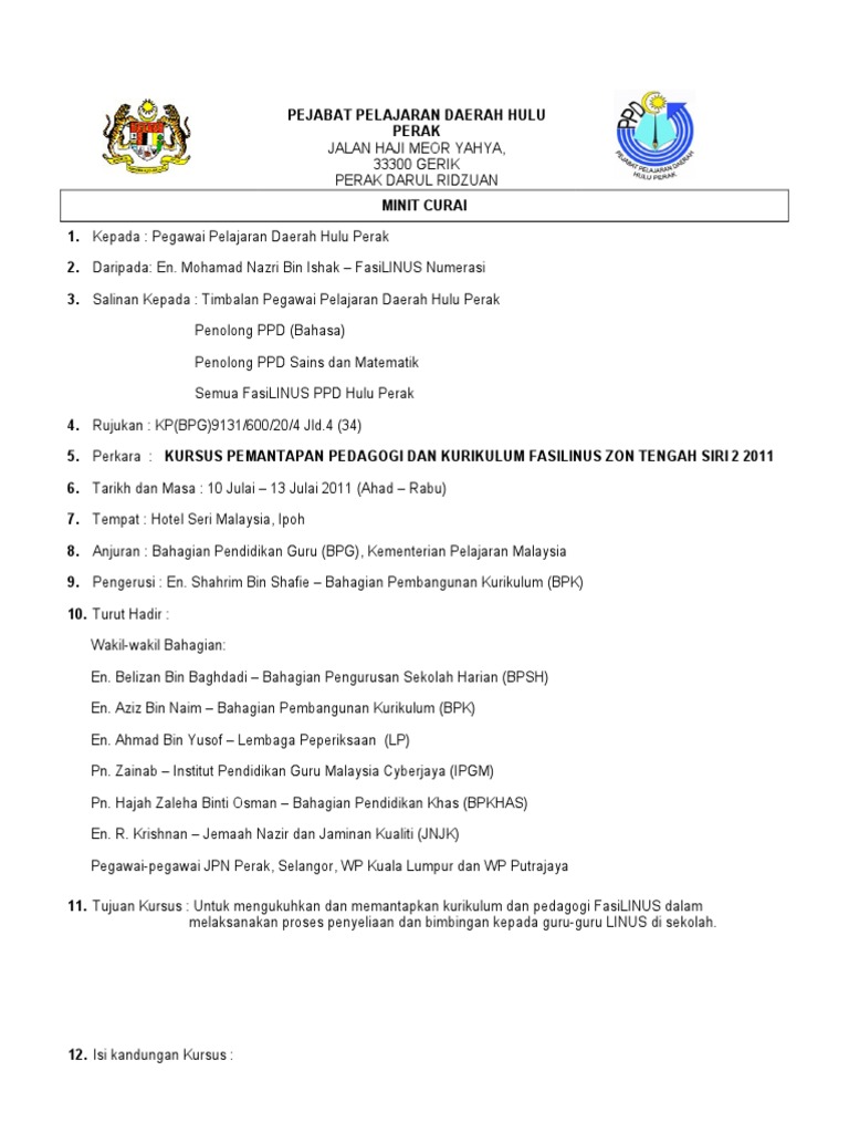 Guru-guru perlu menyerahkan satu salinan hardcopy dan softcopy kepada Guru Besar Pn Maheran Binti Abd Halim serta satu salinan hardcopy kepada Pn. JPA5007600-232 Format Isi Kandungan Latar belakangKandunganTindakan sekolah. Minit curai adalah laporan ringkas yang ditulis oleh guru yang menghadiri kursus bengkel mesyuarat atau perkara yang seumpamanya dengan.