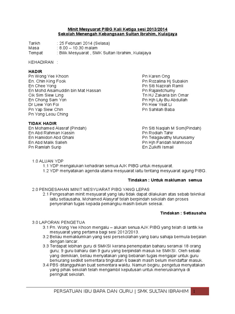 Contoh Minit Mesyuarat Minit mesyuarat merupakan satu laporan mengenai perkara atau hal yang dibincangkan dan diputuskan dalam sesuatu mesyuarat. 1 Minit Mesyuarat Agung PIBG Kali ke-37 SMK Tengku Idris Shah 42200 Kapar Tarikh. View flipping ebook version of MINIT MESYUARAT AJK PIBG KALI PERTAMA SESI 2020 published by majalahsmes on 2020-02-19.