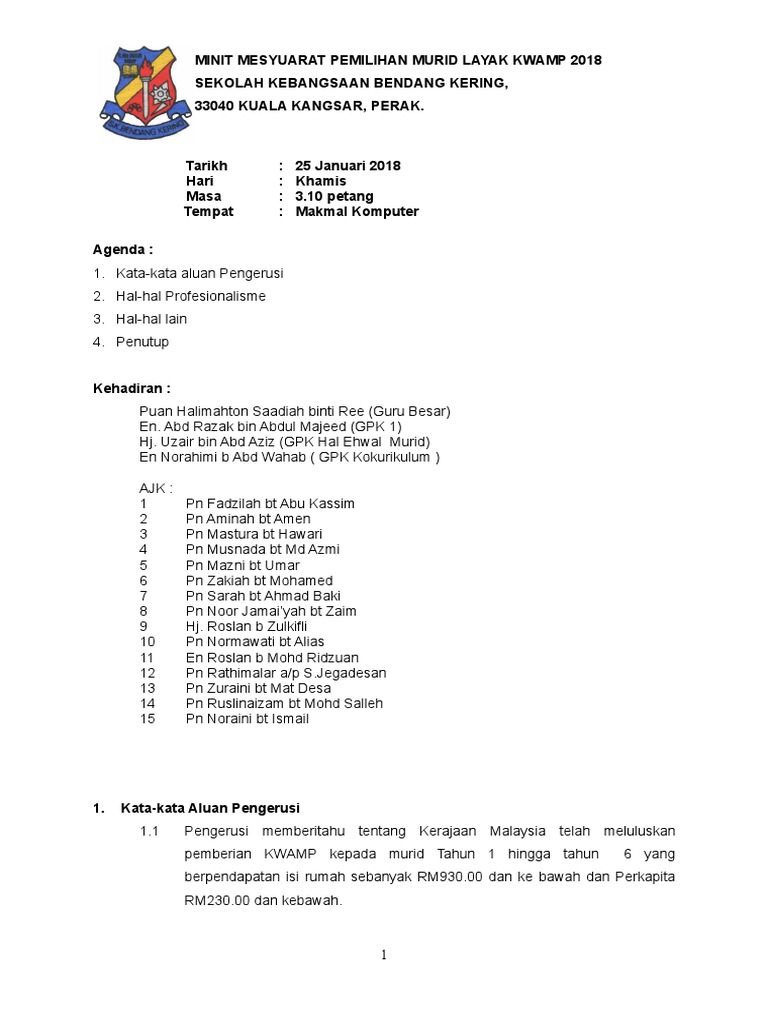 Minit mesyuarat pemilihan murid layak bantuan khas awal persekolahan 1malaysia bkap1m 2016 sekolah kebangsaan kampung beraya miri tarikh hari masa tempat 26 Januari 2016 Selasa 110 petang Bilik Kelas Tahun 6. 2 JANUARI 2015 MASA. SEKOLAH KEBANGSAAN BUKIT MERIAM 08500 KOTA KUALA MUDA KEDAH MINIT MESYUARAT JAWATANKUASA PEMILIHAN KWAPM BIL.