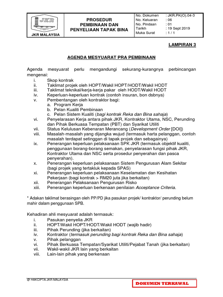 Minit Mesyuarat Pra Pembinaan Tapak Penyelarasan Teknikal Fail Projek 7 Tahun 9 Perakuan Siap Kerja Projek Fail Projek 7 Tahun HAKCIPTA JKR MALAYSIA DOKUMEN TERKAWAL JKR MALAYSIA 80 No. DOKUMEN SERAHAN TAPAK MENGADAKAN MESYUARAT PENYERAHAN TAPAK A 8. Published on May 2018 Categories.